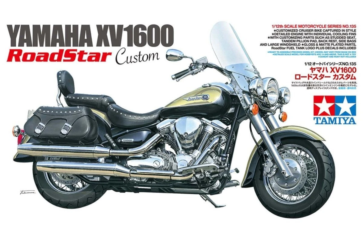 This model kit recreates a customized version of the Yamaha XV1600 Road Star. The standard kit is available as item 14080. The XV1600 Road Star featured a 1,600cc V-twin that made it one of the most powerful motorcycles of its day, with telescopic front suspension and a rear shock tucked out of sight for a classic hardtail look to accentuate the low-slung lines, and liberal use of chrome. Customized bikes had side bags, a larger windshield, and many more variations.