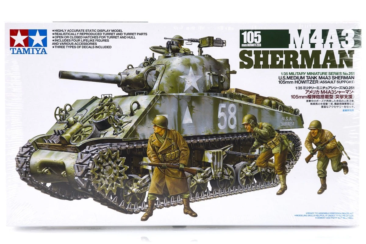 The main tank of the US Army during WWII was the M4 Sherman. Now the M4A3 Sherman equipped with the large 105mm Howitzer is available from Tamiya. This tank model uses poly-caps for the raising and lowering of the gun. Gunners hatch and machine gun clamp are included as separately molded parts. Realistic tank tracks come with rubber pads (paintable) for enhanced authenticity. Three infantry figures from the Ardennes battlefields and the tank commander figure bring a “midst of battle” atmosphere to the kit. Ammunition boxes and ration cases are also included to enhance detail. Decals are included to recreate one of three tank types. Recommended paints: TS-5 Olive Drab. This exciting kit is sure to be a welcomed addition to any of the U.S. Army vehicles in Tamiya’s extensive 1/35 scale MM collection.