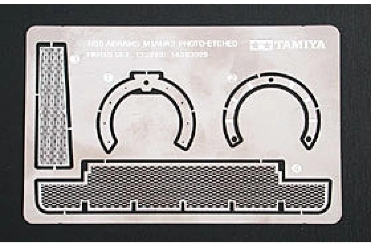 Introducing a photo-etched parts set to add extra detail to the 1/35 M1 Abrams series of tanks. Set includes photo-etched parts for the upper hull grille, machine gun mount rail around the loader fs hatch, and bustle rack on the hull rear (to replace nylon mesh). Can be used with the recently released M1A2 Abrams Operation Iraqi Freedom (Item No. 35269), and M1A1 Abrams (Item No. 35156) and M1A1 Abrams w/Mine Plow (Item No. 35158). About 90mm X 60mm.