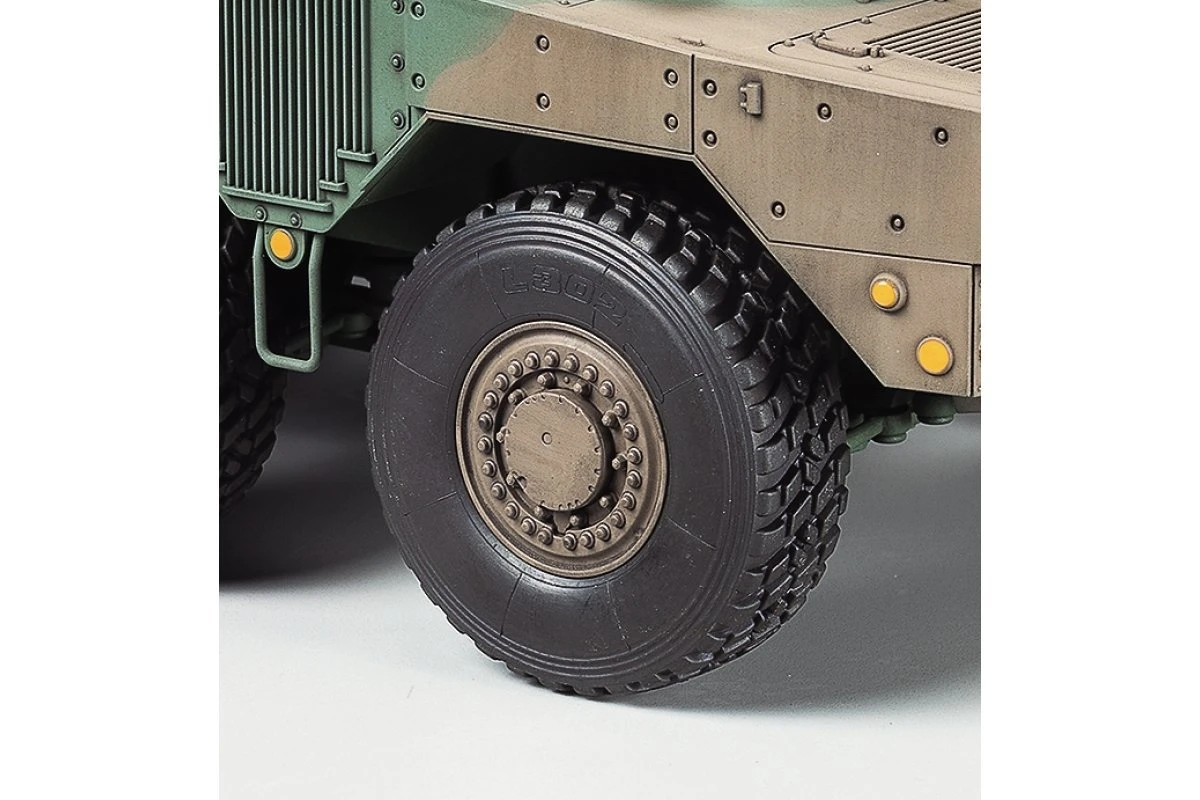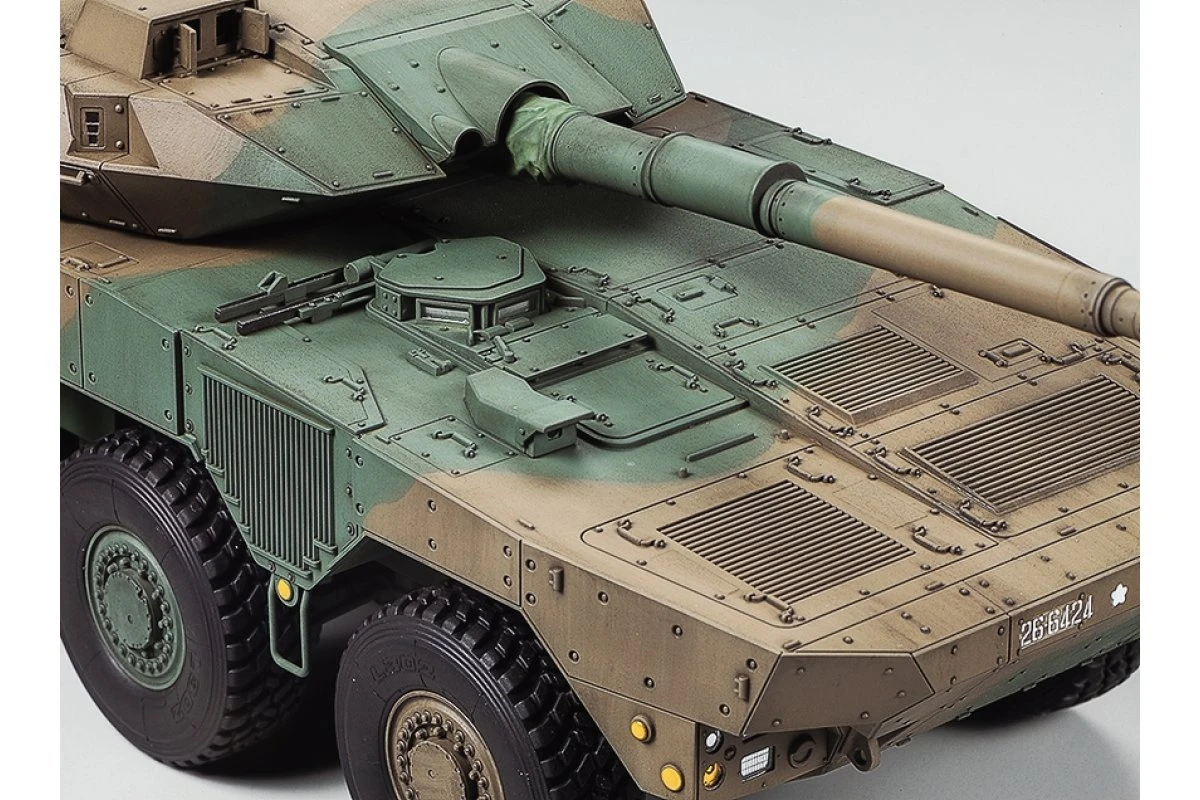 This scale model assembly kit recreates the Japan Ground Self Defense Force (JGSDF) Type 16, which reached units beginning in 2017. An 8-wheel vehicle, the JGSDF classify it as a Maneuver Combat Vehicle (MCV), a highly mobile and well-armed vehicle intended to provide supporting fire and take on enemy armor as a part of rapid response units. Its domestically designed L/52 105mm rifled gun is a low-recoil piece with perforated muzzle brake and a fire control system to enable accurate firing on the move. Rolled steel turret and hull employ modular and spaced armor estimated to be able to survive frontal hits from 20-30mm class guns and portable anti-tank weapons. Thanks to its 570hp engine, the 26-ton Type 16 has a top speed of around 100km/h and significant range; it looks set to provide a major boost to JGSDF units as its rollout continues.
