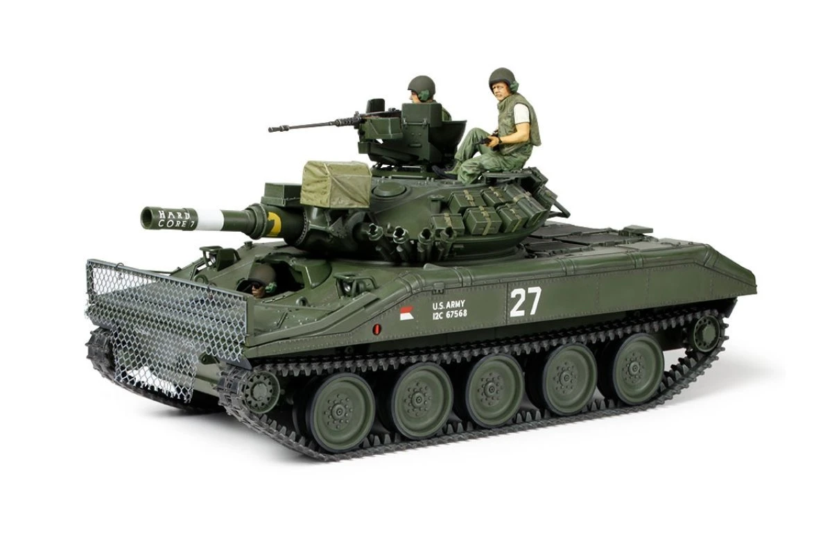 This model kit recreates the M551 Sheridan Armored Reconnaissance/Airborne Assault Vehicle (AR/AAV). The M551 was designed as airdrop capable armor with wading capabilities, a key concept as the U.S. took on the role of global policeman post WWII. With an aluminum hull and rolled steel turret, it weighed just 15 tons, but had impressive firepower in the shape of the M81 152mm gun/launcher, which could fire standard rounds and MGM-51 Shillelagh missiles. The M551 was in service with active units from 1968 to 1996, and saw action in the jungles of Vietnam.