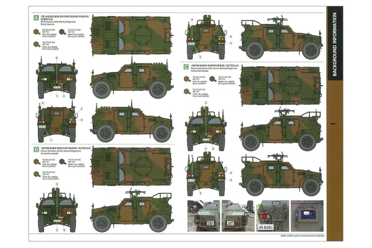 This Tamiya 1/35 scale model kit recreates a domestic-specification Japanese Self Defense Force Light Armored Vehicle. A previous release kit (item 35275) depicted an Iraq PKO spec vehicle. The Light Armored Vehicle is an integral part of Japan Ground Self-Defense Force (JGSDF) infantry units, key to the emphasis placed on mobility by recent policy changes. Around 1,900 in total have been provided to the JGSDF and the JASDF air arm.