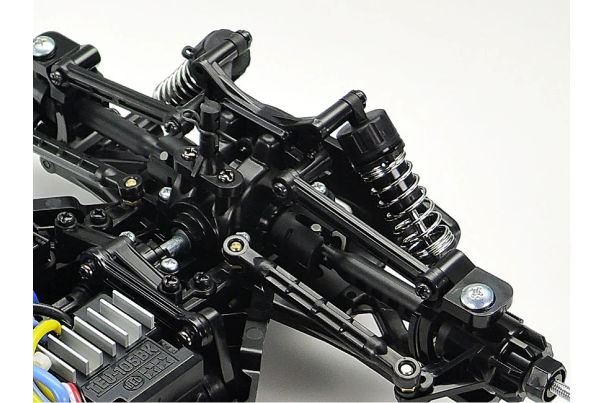 The shaft-driven 4WD TT-02B buggy chassis employs a skid-shaped frame. Its suspension setup uses 4-wheel independent double wishbone suspension with long arms, plus white CVA oil shock units, giving the car assured handling, while left/right suspension arms and uprights are identical to facilitate hassle-free assembly. Front/rear gearboxes include 4-bevel differentials for smooth operation, and are sealed to ensure that dust can’t get inside. The top can be removed simply by loosening a few screws, making maintenance a breeze. 4 different gear ratios can be applied with the use of 3 separately-sold types of pinion gear, allowing you to match the characteristics of your car setup to the conditions at any given time. Of course, this off-road chassis also includes receiver case and motor cover to protect them from dirt and debris thrown up off of the track.