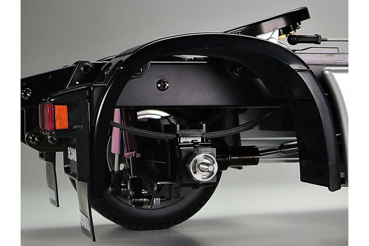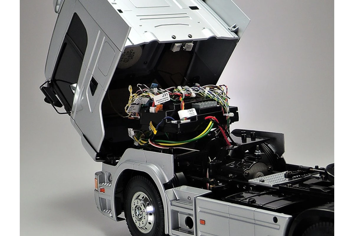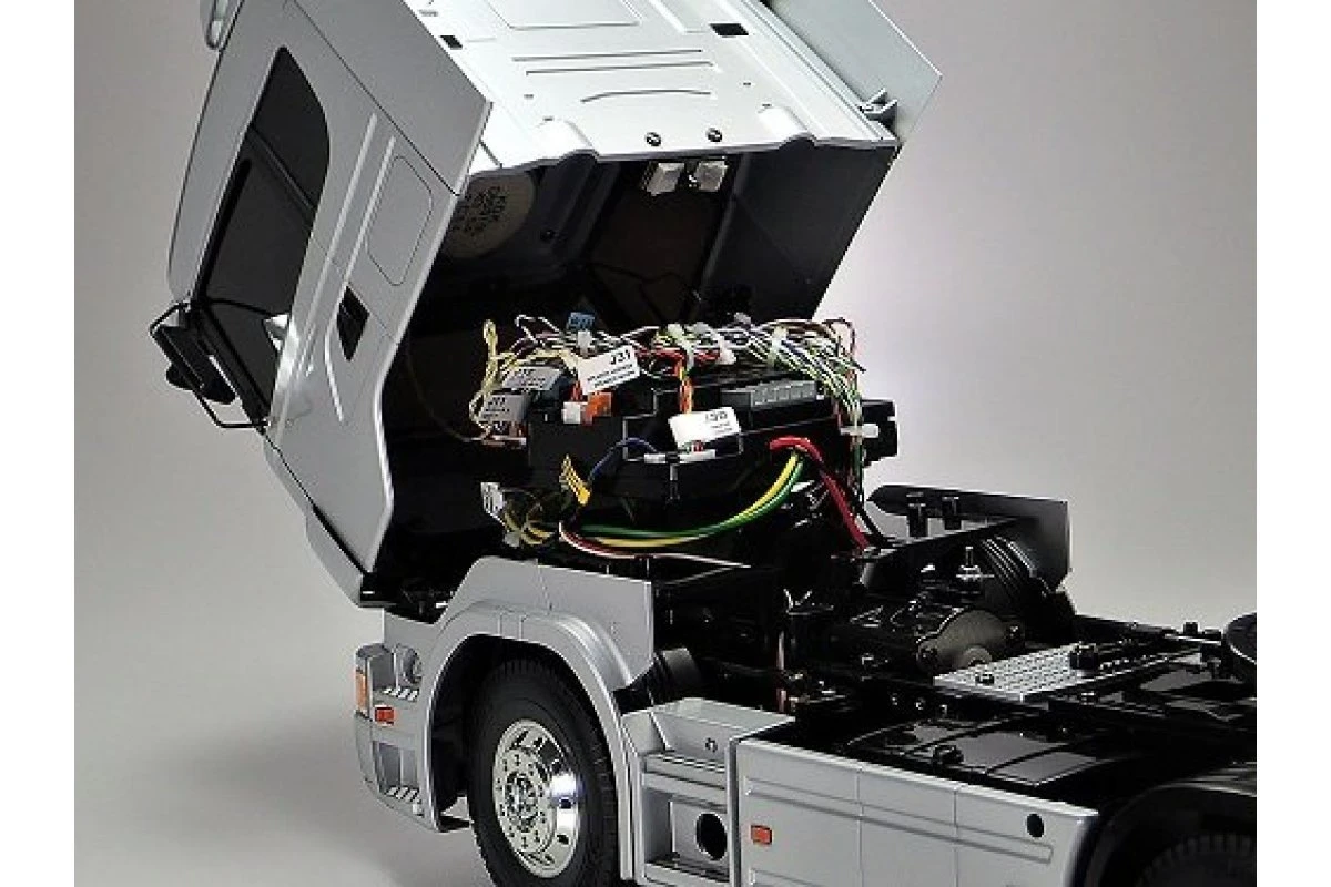 This R/C model assembly kit recreates the R470 Highline, which belongs to Swedish manufacturer Scania’s International Truck of the Year 2005 award-winning R Series. It is based upon a realistic chassis with aluminium side channels and plastic cross members, with metal leaf spring suspension and internally-sprung dampers. Assembly of the 3-speed transmission is effortless, and when used with a 4-channel transmitter, it will give fans full control of realistic gear shift operations. A beautifully reproduced cabin tilts forward separately from the fenders, just like the actual truck and the interior and exterior of the f