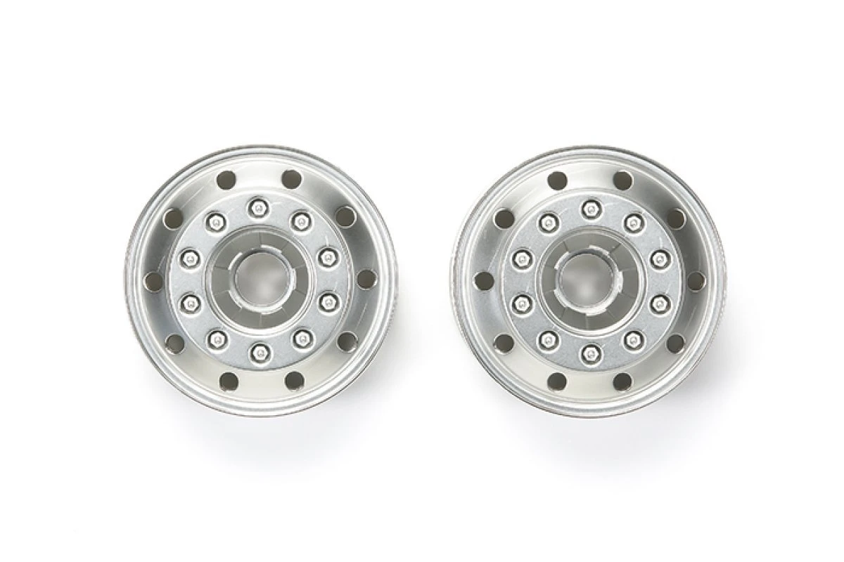 Actual trucks used in logistics networks are often seen with plain natural metal wheels made of steel or aluminum. To depict this type of wheel, these matte finish metal-plated wheels for 1/14 scale R/C tractor trucks are available as an option wheel set. By simply replacing with kit-standard gloss finish metal-plated wheels, you can give your truck a different appearance. These wheels are designed for use with tires with 22mm width.