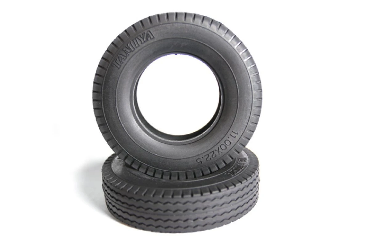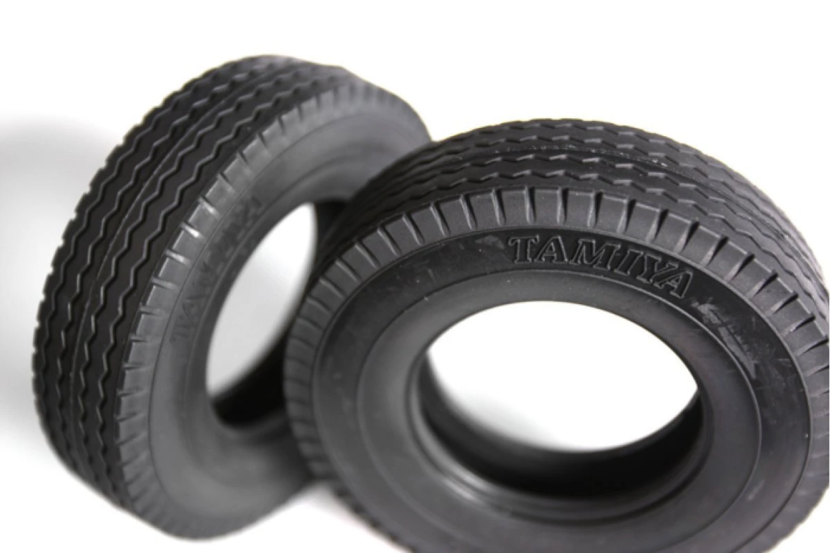 These tractor truck tires are made of a hard compound material which is well-suited to use on Tamiya 1/14 scale tractor trucks. Using these tires on the front of the trailer combats over-steer and rear sliding to provide a more stable driving experience. Fitting them to the trailer means smoother cornering to lower traction.