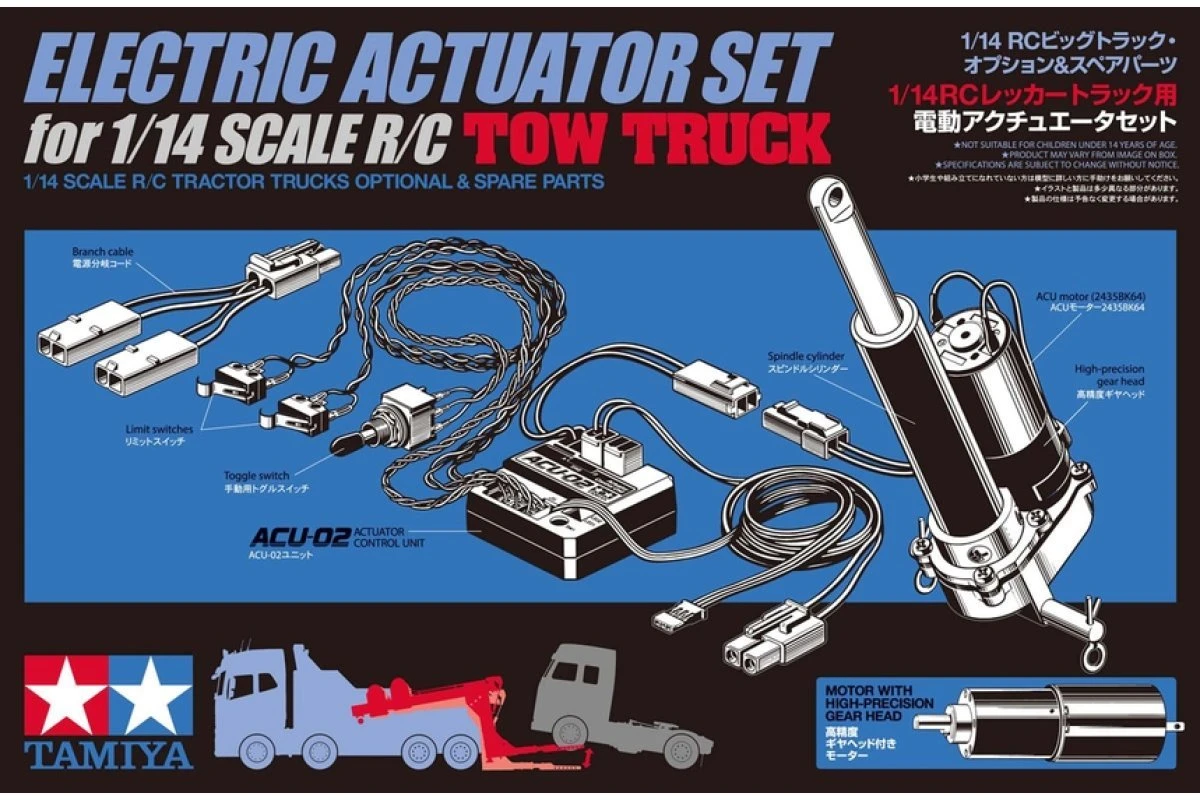 This set allows control of the winch boom/underlift on the Tamiya Volvo Globetrotter 750 8×4 Tow Truck model (Item 56362). Install it to your truck and use your transmitter to raise and lower the boom smoothly and steadily.