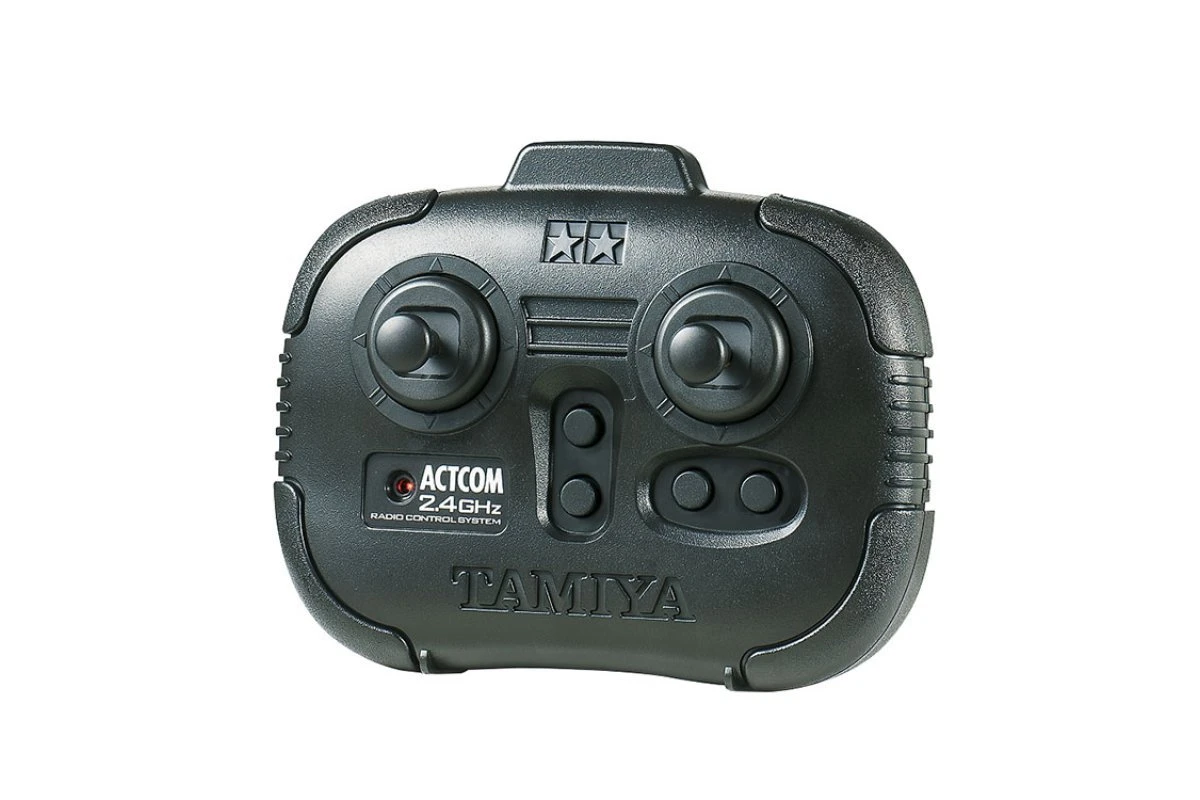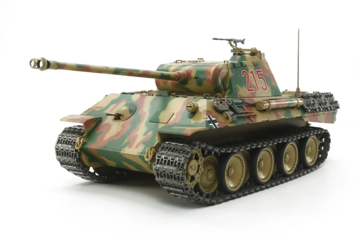 hTis is a 1/25 R/C model assembly kit which depicts the Panther Ausf.A, capturing the legendary tank’s sloped form and 75mm gun with great realism. Included 2.4GHz R/C unit virtually eliminates signal interference and allows simultaneous use of multiple models. It utilizes a dedicated transmitter and MC-07 receiver/motor control unit, with tank movement speed and turns controlled by the left transmitter control stick. An assembly-type twin gearbox is installed in the hull front. The kit comes with three marking options, including one for Free French Forces.