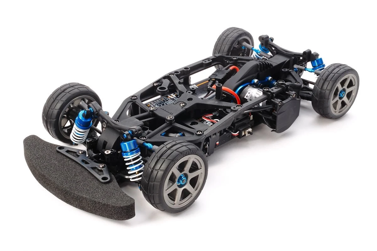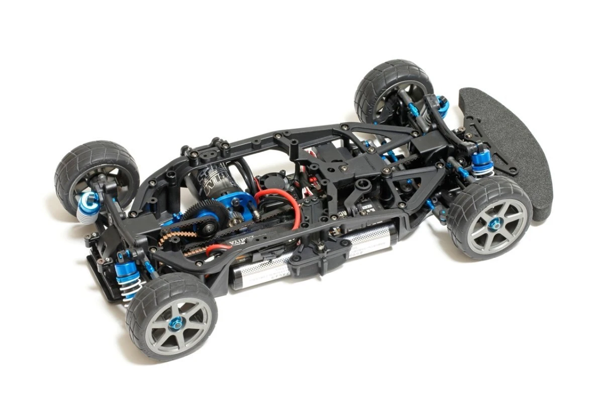 This 4WD R/C touring car chassis assembly kit is based around a composite structure that consists of a narrow lower deck and an upper frame. The part design layout provides the chassis optimal torsional rigidity which can be further adjusted by removing the frame center section. The highly efficient single belt drivetrain offers 3 motor position locations, each with its own performance characteristics suited to different tracks and setups. Proven TRF419 design suspension, gear differential units and steering components are joined by proven TRF aluminum shock dampers and universal shafts to make this chassis a hi-spec racer!