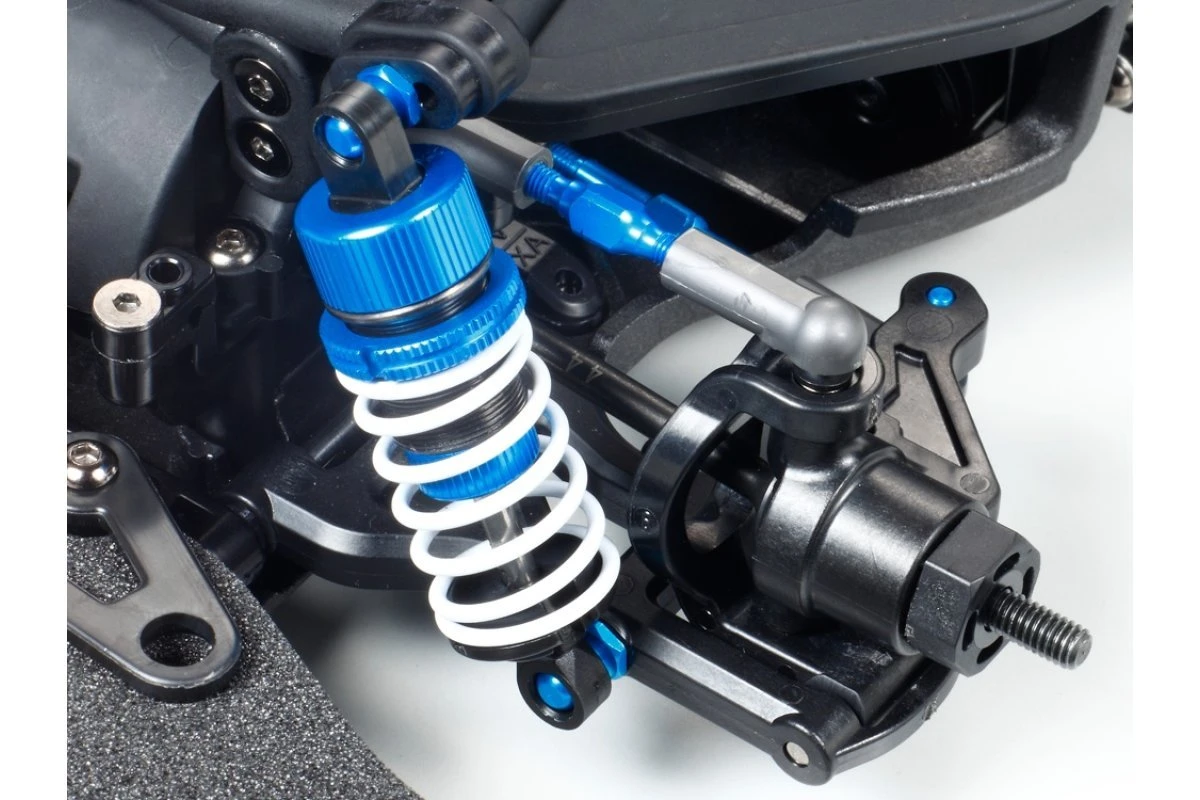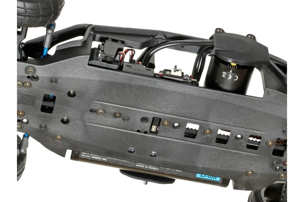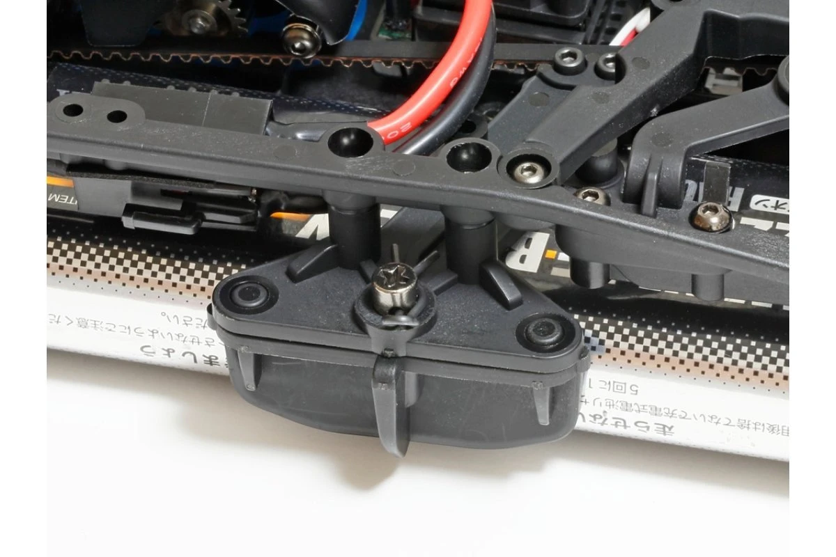 TRF419 suspension parts and gear differentials give top-level performance and reliability. Like on the TRF419, the servo mount is attached on one side only, with chassis flex in mind. The battery can be removed via the chassis side.