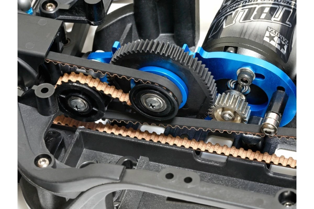The efficient single belt winds back around the main and counter pulleys. Using one belt as opposed to two facilitates the changeable motor position feature. It allows simple reconstruction of the chassis using the existing belt rather than many different lengths.