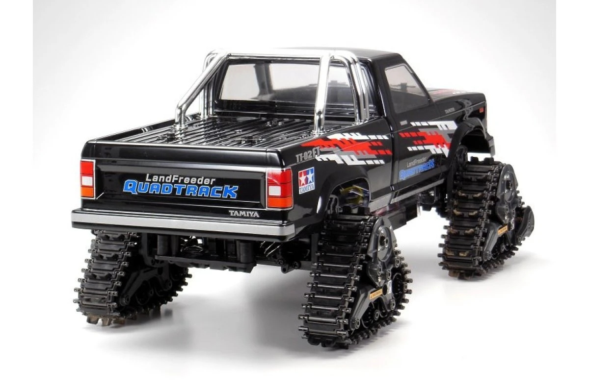 The Landfreeder Quadtrack is a fresh new twist on the fun world of Tamiya R/C. This kit uses a new variant of the TT-02 chassis with three-sided track units in place of the wheels: the result is awesome traction that can take on rough terrain. Furthermore, the polycarbonate truck body comes already pre-painted in Tamiya PS-5 black.