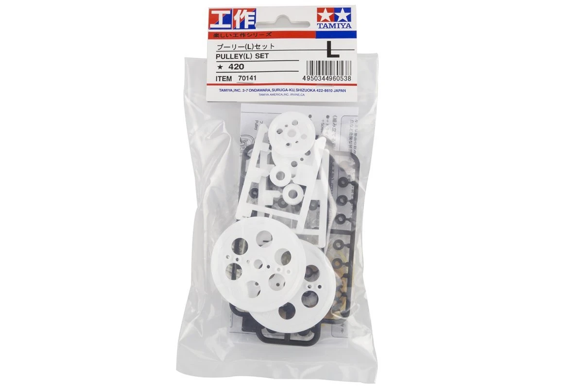 These pulleys may be used as part of a power transfer system or a gear reduction system. Simply cross the rubber band over to reverse the rotation direction. In addition to the three types of pulleys, axle bushings are also included which are compatible with 2mm and 3mm hex shafts as well as 2mm and 3mm round shafts. A 1m long rubber cord as well as normal rubber bands complete the set.